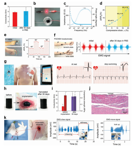 Figure 4. 生物穩(wěn)定的PGCNSH的電學(xué)性質(zhì)及其在表皮和植入式生物電子器件中的應(yīng)用。