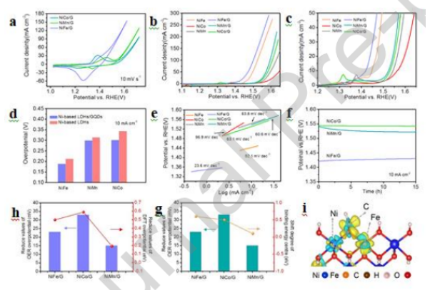 探索具有最佳電子結(jié)構(gòu)的電催化劑,了解電子結(jié)構(gòu)與活性之間的關(guān)系是設(shè)計(jì)先進(jìn)OER催化劑的重要要求。最近,已證明將納米碳材料引入LDHs是提高OER活性的有效方法。然而,深入了解納米碳對(duì)LDHs電子結(jié)構(gòu)的調(diào)控作用仍然是一個(gè)重要的挑戰(zhàn)。本文報(bào)道了吸附石墨烯量子點(diǎn)(GQDs)調(diào)控鎳基層狀雙氫氧化物(NiM-LDHs (M=Fe, Co, Mn))的表面電子結(jié)構(gòu)的研究。鎳基LDH/GQDs具有增強(qiáng)的OER活性,尤其是NiFe LDH/GQDs具有189 mV(10 mA cm