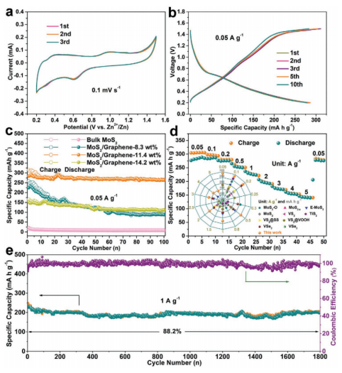2/石墨烯納米片自組裝成花朵狀結(jié)構(gòu),有利于鋅離子擴散,促進電解質(zhì)滲透,并確保高結(jié)構(gòu)穩(wěn)定性。因此,這種新型的MoS
