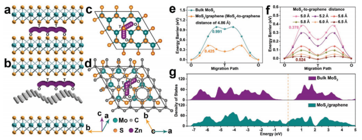 2/石墨烯的鋅離子遷移路徑。e,f) 遷移能壘。g) MoS