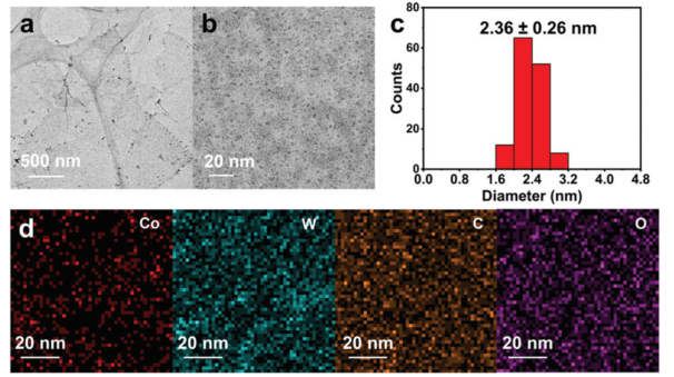 4/GO催化劑前體的(a)低放大倍率和(b)高放大倍率TEM圖像。(c)基于TEM圖像統計GO上負載的CoWO