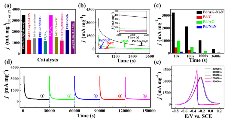 -1,具有極好的電活性,是Pd/C(商業催化劑)的5.24倍。值得注意的是,經過計時安培測量后,Pd/AG-Ni