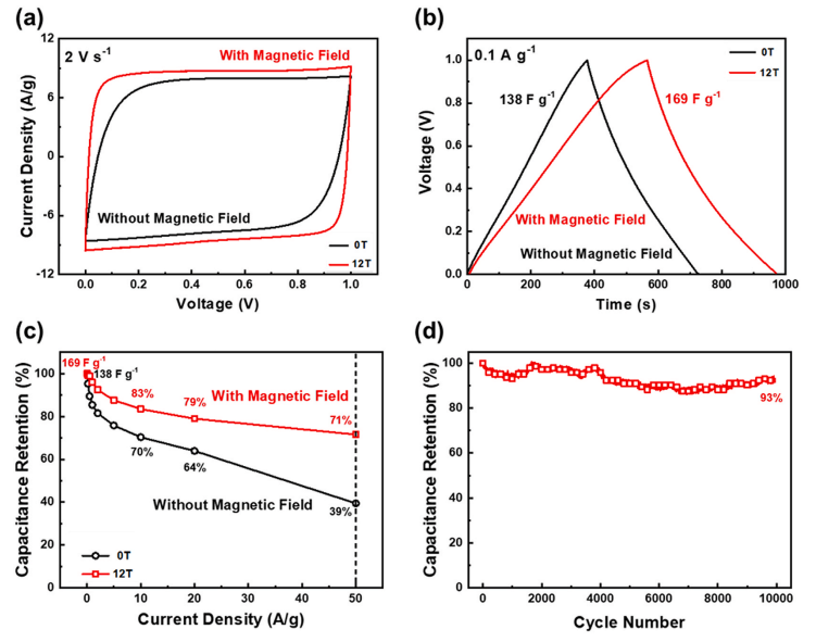 石墨烯已被廣泛用作超級電容器電極材料。但是,平行堆疊的石墨烯層通常會導致無效的離子擴散和電子轉移,這通常會降低超級電容器的倍率性能。本研究采用溶劑蒸發法,以PEDOT:SS為粘合劑,固定取向石墨烯,以良好的導電性以及與石墨烯片的強烈π-π堆疊相互作用固定,制備了還原氧化石墨烯(rGO)和聚(3,4-乙撐二氧噻吩)聚苯乙烯磺酸鹽(PEDOT:PSS)復合膜。使用掃描電子顯微鏡(SEM)、氮吸附-解吸和小角度X射線散射進行的分析表明,盡管施加了磁場,但石墨烯片在沒有磁場的情況下隨機取向,但它們排列良好。作為電容器電極材料,排列整齊的rGO在電流密度為50 A g-1時顯示出169 F g-1的比電容,電容保持率約為70%,并且在90℃時,其循環伏安(CV)曲線仍然保持矩形。電壓掃描速率為2 V s−1。對準的rGO電極可以幫助突破傳統超級電容器的局限性,并顯著提高其充電/放電速率和功率密度。