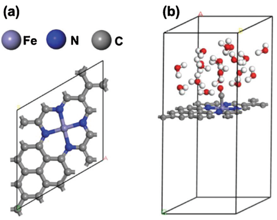 Figure 1. 建模系統的結構:包括Fe-N-Gra催化劑、明顯的溶出物和被吸附物。(a)Fe-N-Gra表面的俯視圖;(b)以純水系統中吸附的CO為例,整個系統的側視圖。