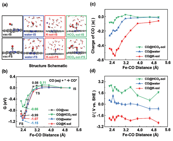 3-sol系統中,CO吸附到Fe中心期間,通過AIMD模擬IS和FS的結構快照。(b)在不同類型系統下,用于CO吸附的自由能分布圖。(c)CO的電荷和(d)系統的電極電勢U。