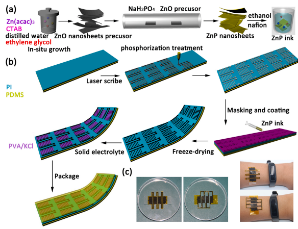 Synthesis process and optical images of an all-in-one stretchable microsupercapacitor arrays (MSCAs) based on hybrid electrodes with ultrathin ZnP nanosheets anchored on 3D laser-induced graphene foams (LIG) configured in an island-bridge layout.
