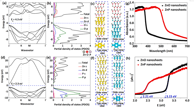 Figure 4. ZnO和ZnP納米片的電子結(jié)構(gòu)和紫外可見吸收光譜