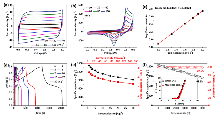 -2)的高質(zhì)量(面積)電容以及長(zhǎng)期穩(wěn)定性。除了高能量密度(245 mWh cm
