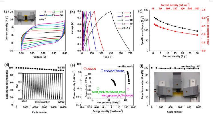 Figure 6. 基于ZnP@LIG電極的多合一平面MSC的電化學(xué)性能