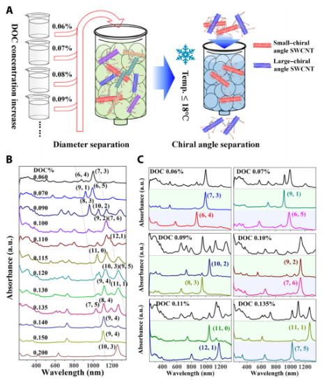 無論是通過生長還是分離,大規模生產之字形和近之形單壁碳納米管(SWCNTs)仍然是一個挑戰,其之前未知的性質阻礙了實際應用。在這里,我們報道了一種通過凝膠色譜中膽酸鈉(SC)和SDS二元表面活性劑體系的溫度控制,通過手性角度分離SWCNTs的方法。有效分離了手性角小于20°的11種單手性SWCNT物種,包括多種之字形和接近之字形的物種。其中亞毫克級為(7,3)、(8,3)、(8,4)、(9,1)、(9,2)、(10,2)和(11,1)。光譜檢測結果表明,降低溫度會導致SC/SDS助表面活性劑在具有不同手性角的SWCNT上的選擇性吸附和重組,從而放大了它們與凝膠的相互作用差異。我們認為這項工作是工業化分離單手性之字形和近之字形SWCNTs的重要一步。