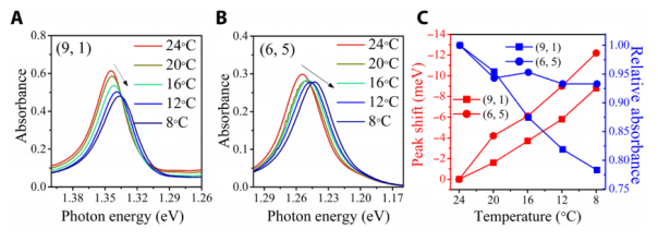 Fig. 4 溫度對(6,5)和(9,1)SWCNTs光學吸收光譜的影響。