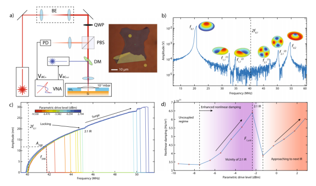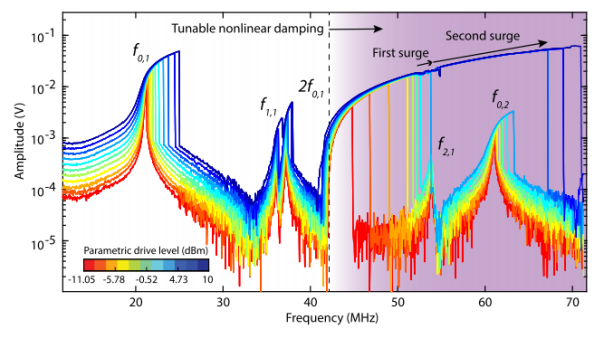 從固態物理學到熱力學,非線性阻尼的機械源在現代物理學中起著核心作用。機械耗散的微觀理論表明,當共振模式的非線性阻尼耦合到接近其共振頻率兩倍的振動模式時,可以大大增強共振模式的非線性阻尼。迄今為止,尚未實現這種增強的實驗證據。在本文中,我們通過實驗證明,納米諧振器驅動成直接參數內共振,為非線性耗散的微觀理論提供了支持證據。通過調節驅動電平,我們可以在40-70 MHz的范圍內調整石墨烯納米鼓的參數共振,以達到連續的二對一內部共振,從而使非線性阻尼幾乎增加了兩倍。我們的研究開辟了一條利用模態相互作用和參數共振來實現具有工程非線性耗散的寬頻率范圍諧振器的途徑。