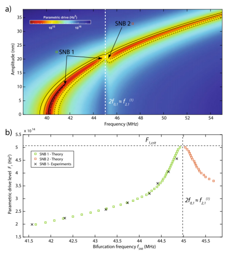 Fig. 1 石墨烯納米鼓在2:1內部共振附近的非線性動態響應。