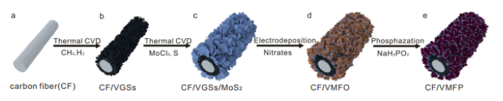 Figure 1. 樣品制備過程示意圖。a–d CF/VMFO的制備步驟。e 由CF/VMFO制備成CF/VMFP的過程。