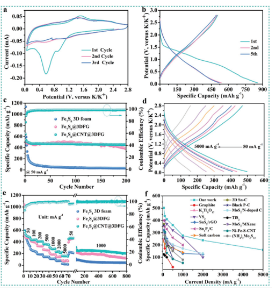 Figure 3. a)Fe7S8@CNT@3DFG電極在最初三個循環時的CV曲線。b)Fe7S8@CNT@3DFG電極在不同循環中的放電曲線。c)循環穩定性和庫侖效率。d)Fe7S8@CNT@3DFG電極在各種電流密度下的充電/放電曲線。e)倍率特性。f)與先前報道的工作做對比。