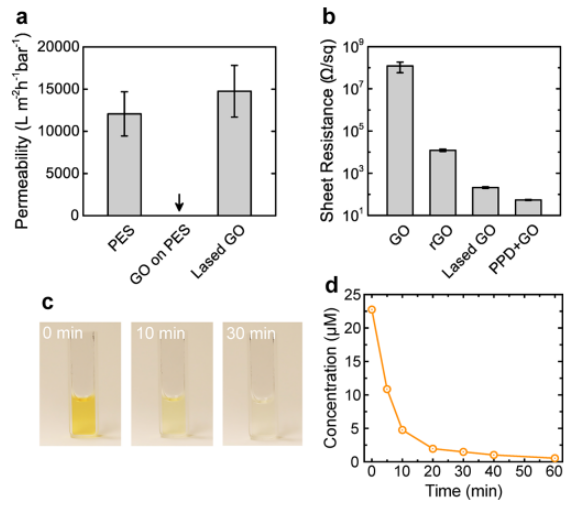導(dǎo)電膜是一種有前途的減少水處理成本的途徑,因?yàn)樗鼈兡軌蜃畲蟪潭鹊販p少污垢的有害影響,降解污染物,并在過(guò)濾過(guò)程中提供其他利處。這里,利用激光還原氧化石墨烯(GO),構(gòu)建了一種導(dǎo)電膜,該實(shí)驗(yàn)方法便捷且成本低。首先,將GO過(guò)濾到聚醚砜膜載體上,然后通過(guò)激光熱解沉積成導(dǎo)電膜。激光還原GO復(fù)合膜可用于滲透水,薄層電阻低至209Ω/□。施加電壓為8V時(shí),激光還原GO膜去除97%以上的水污染物,25μM甲基橙染料。此外,該研究表明,通過(guò)加入對(duì)苯二胺結(jié)合分子,可以進(jìn)一步減少激光還原GO膜的薄層電阻(54Ω/□)。
