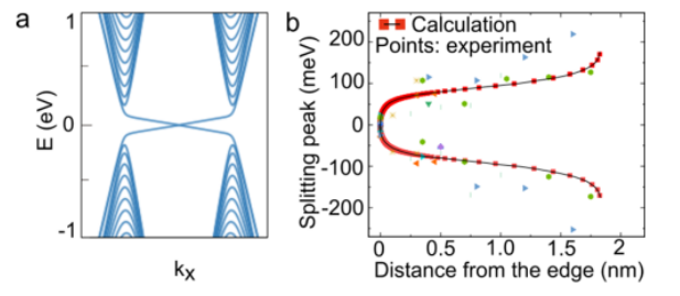 Figure 4 zz-GNR能帶結構的緊密結合計算。(a)K?和K?'點周圍的縱向能帶結構。(b)在STS中觀察到的峰能量與橫向距離的關系。