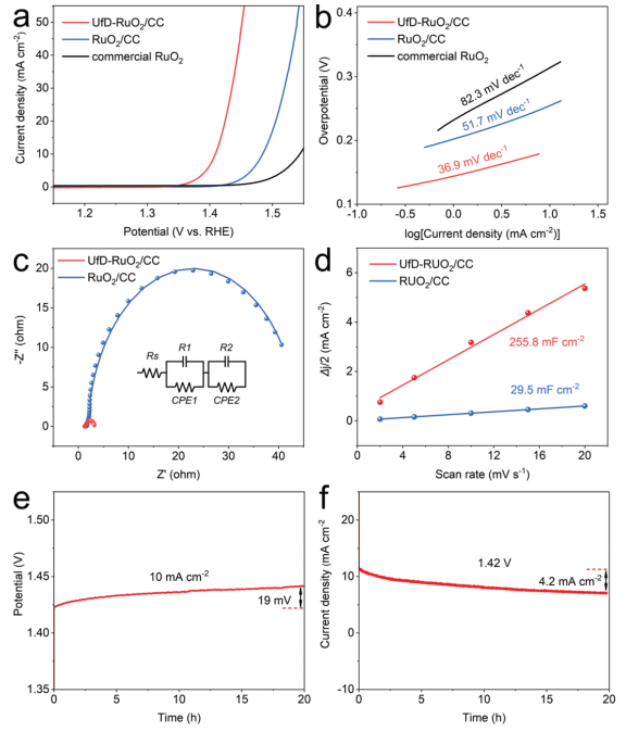 -2的固定電流密度下的穩定性測試。f)UfD-RuO