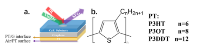 石墨烯和半導體聚合物已被廣泛研究用于許多微電子設備中。對于具有層狀結(jié)構(gòu)和石墨烯半導體聚合物復合材料的設備,石墨烯和半導體聚合物之間的分子相互作用在確定界面性質(zhì)和影響設備性能方面都起著重要作用。本研究利用和頻發(fā)生(SFG)振動光譜法測定了三種不同側(cè)鏈長度的聚噻吩(PTs)在PT/石墨烯界面上的分子取向。發(fā)現(xiàn)PT側(cè)鏈越長,測得的PT主鏈傾斜角越大。因此,具有較長側(cè)鏈長度的PT主鏈在石墨烯上采用了更平躺的姿勢。不同側(cè)鏈長度的PTs在PT/CaF2界面上的取向傾角變化趨勢相同。當比較相同的PT骨架取向時,PT/石墨烯界面處的PT通常比PT/ CaF2界面處的PT更向下,這是由于PT骨架共軛環(huán)與石墨烯之間更強π−π 的分子間相互作用。界面上不同的PT主鏈取向可能是由于PT主鏈與底物之間以及側(cè)鏈與底物之間的相互作用以及PT分子(包括側(cè)鏈和主鏈)之間的分子間和分子內(nèi)相互作用引起的。掩埋界面上PT骨架取向的確定有助于理解這些界面上的分子相互作用,有助于設計具有最佳結(jié)構(gòu)和改進性能的聚合物/石墨烯界面。