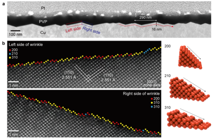 圖2. 具有高刻面原子排列的高密度Cu臺階位的交叉觀察和每個納米褶皺斜率的相關(guān)原子尺度分析。