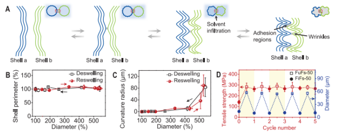 Figure 3.可逆融合和裂變的動態形貌變形機制。(A)自融合和自裂變的可逆恢復的殼層形貌皺褶示意圖。(B)在膨脹和溶脹過程中,單根水溶脹GO纖維的殼周長隨纖維直徑的變化。(C)在不同纖維直徑下單位波紋的平均尖端曲率半徑。(D)FuF-50和FiF-50的拉伸強度和相應的直徑與循環次數的函數關系。