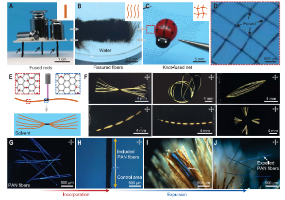 Figure 4.可逆融合實現了可控轉變。(A-D)不同過程時的可逆轉變的照片。(E,F)示意圖和偏光光學照片。(G-J)偏光光學顯微鏡圖像,顯示聚丙烯腈(PAN)短纖維通過熔合捕獲FuF和裂變可逆排出。