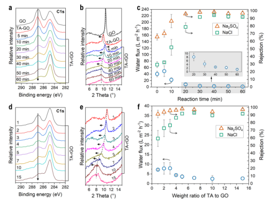Figure 2. 原始GO和TA-rGO膜的(a,d)XPS C 1s光譜,(b,e)XRD光譜和(c,f)分離性能。