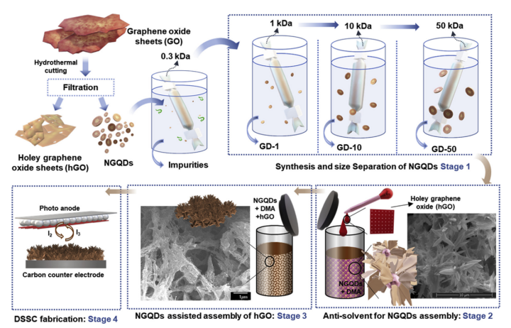 通過堆疊的石墨烯納米片,復(fù)雜電解質(zhì)的擴散限制了它們的電化學(xué)性能。作為一種潛在的解決方案,本研究探索了氮摻雜石墨烯量子點 (NGQDs) 在誘導(dǎo)多孔氧化石墨烯 (hGO) 納米片上3D多孔取向方面的潛力。用于相分離輔助組裝的NGQDs和反溶劑的尺寸經(jīng)過優(yōu)化,以實現(xiàn)3D納米多孔網(wǎng)絡(luò)。該納米網(wǎng)絡(luò)作為hGO多孔取向的軟模板,形成3D分層多孔碳結(jié)構(gòu)。受益于3D框架的孔隙率,從根本上避免了π-π重堆疊,提供了高電解質(zhì)傳輸速率。此外,NGQDs的摻雜氮和J型聚集有效地調(diào)整了能帶結(jié)構(gòu),以實現(xiàn)低過電位下的電荷轉(zhuǎn)移。復(fù)合結(jié)構(gòu)增強的電催化活性和極低的電荷轉(zhuǎn)移電阻歸因于增強的電極/電解質(zhì)界面和多維電荷和電解質(zhì)傳輸。基于多孔復(fù)合結(jié)構(gòu)的對電極在染料敏化太陽能電池中顯示出 78% 的光伏性能增強(與未改性的石墨烯相比),這與Pt電極的性能相當(dāng)。所提出的 3D 多孔取向可用于新興的電催化應(yīng)用,例如超級電容器、水分解和電池電極。