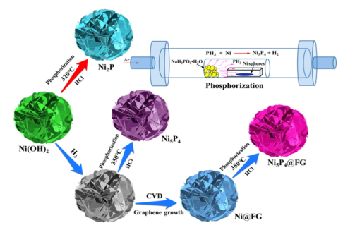 Figure 1. Ni2P、Ni5P4 和 Ni5P4@FG 分級球的合成過程示意圖和磷化裝置。