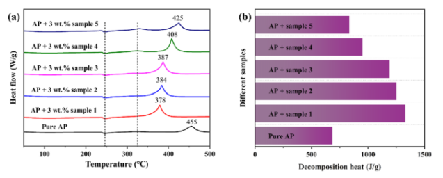 Figure 3. (a) 含和不含 GO/Fe2O3 納米復合材料的 AP 熱分解的 DSC 曲線; (b) 放熱過程中有和沒有催化劑的 AP 分解情況。