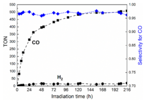 Figure 3. 在0.05 M BIH為犧牲劑和0.1 M PhOH為弱酸性共底物的情況下,CO2飽和的ACN懸浮液中, Coqpy@GA隨時間產生CO和H2,涉及到TON(黑色)和選擇性(藍色)。