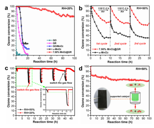Figure 4.三維分級的MnO2@GR的高效臭氧轉化。a.不同樣品的臭氧轉化率比較。b .α- MnO2和7.50% MnO2@GR在50%相對濕度下的臭氧轉化及其再生性能。c.在交替相對濕度下,7.50% MnO2@GR的臭氧轉化。在50%相對濕度下負載催化劑的臭氧轉化。插圖:不銹鋼網上涂有7.50% MnO2的照片。實驗條件:0.1 g催化劑。