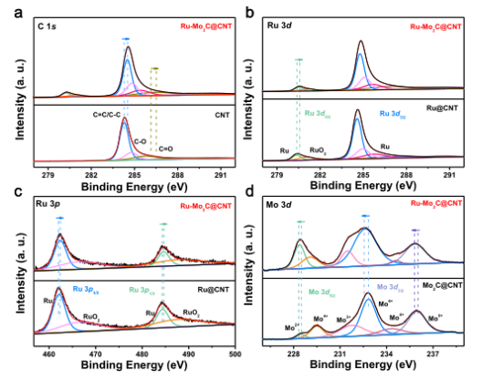 Figure 2. Ru-Mo2C@CNT催化劑的高分辨率XPS光譜,包括C 1s, Ru 3d, Ru 3p, Mo 3d的XPS圖譜。