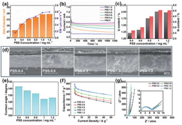 Figure 3.(a)在不同劑量PSS電解質中的電泳遷移率。(b)不同PSS劑量下的沉積電流-時間曲線。(c)硫含量和氮含量,(d)橫截面FE-SEM圖像,(e)接觸角,(f)倍率性能,和(g) 不同劑量PSS的dGFs的EIS譜(插圖顯示高頻-中頻區域的放大圖像)。