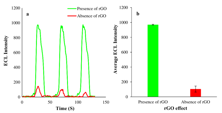 2+混合液中有無還原氧化石墨烯的三個連續的ECL信號。(b)平均ECL強度對應的直方圖。