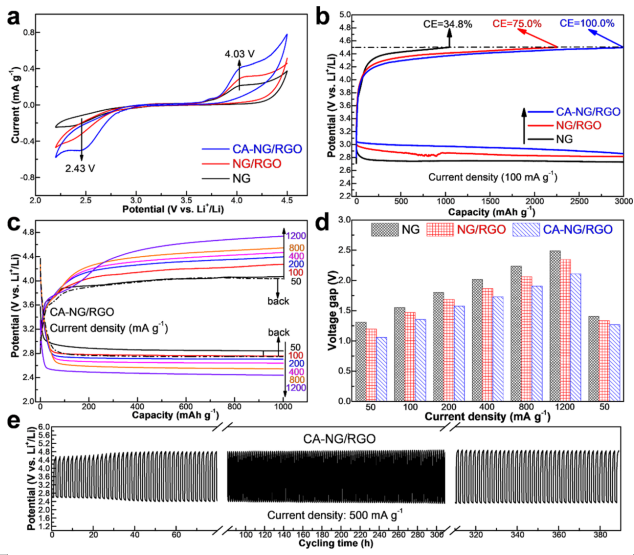 Figure 5. Li-CO2電池中NG、NG/RGO和CA-NG/RGO正極的CRR和CER圖示。