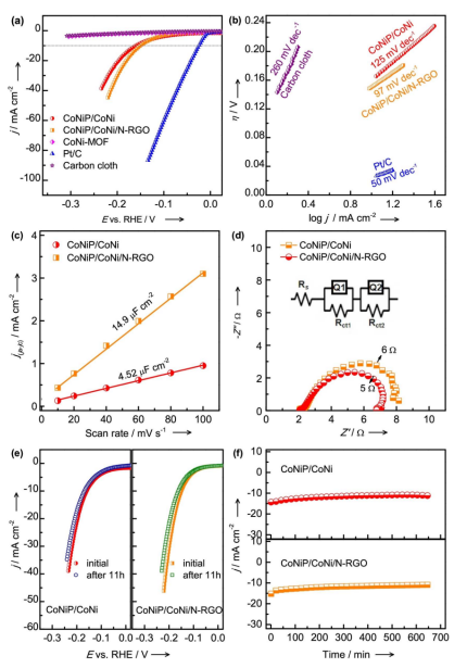 10)下具有低的過(guò)電勢(shì)300 mV。Ni和Co金屬的協(xié)同作用,以及集成半導(dǎo)體磷化物/金屬合金的界面性質(zhì)和MOF衍生碳的電子電導(dǎo)率調(diào)節(jié)了催化劑的性能。此外,雙金屬CoNiP/CoNi合金催化劑散布著N摻雜的石墨烯,形成三元組催化劑,由于三元組催化劑的界面效應(yīng),大的電化學(xué)活性表面積,并從N摻雜石墨烯中增強(qiáng)了的導(dǎo)電性,對(duì)析氫反應(yīng)(η10=150 mV)表現(xiàn)出優(yōu)異的活性和優(yōu)異的耐久性。含碳催化劑在OER(氧化)過(guò)程中的穩(wěn)定性因雜原子摻雜劑的高反應(yīng)性而改變。組裝的CoNiP/CoNi/N-RGO||CoNiP/CoNi水電解槽在10 mAcm-2下可提供 1.76 V 的合理電池電位。因此合成的雙金屬CoNiP/CoNi合金基三元組催化劑表現(xiàn)出優(yōu)異的電催化活性和高耐久性,適用于高效堿性水分裂。