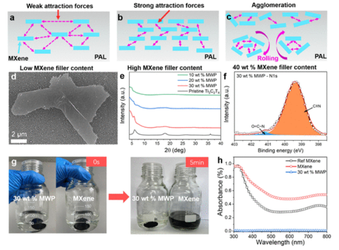 x和具有不同填料含量的MWP的XRD圖。(f)30 wt% MWP的N1s XPS譜圖。(g) MXene和MWP在乙醇中超聲處理5分鐘后粘附穩(wěn)定性的比較。左圖顯示將MXene和30 wt% MWP涂覆的石英基板置于50 mL乙醇中。(h)超聲處理5分鐘后MXene和MWP(30 wt% MXene)的紫外可見(jiàn)光譜。MWP石英超聲溶液的吸光度約為0.006%,遠(yuǎn)低于純MXene石英超聲溶液和參考溶液。