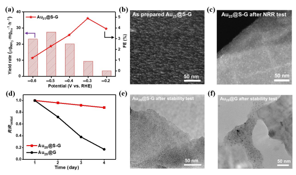 25@S-G經(jīng)過(guò)96小時(shí)NRR穩(wěn)定性測(cè)試后的TEM。(f)Au