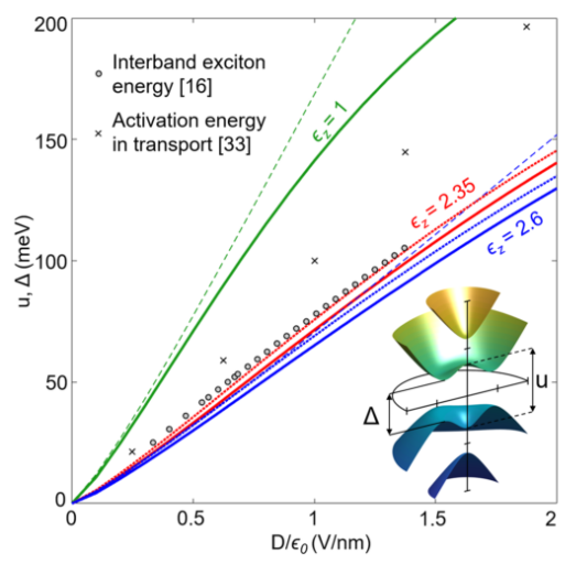 1= 0.35 eV 和相同的其他參數計算的間隙值。草圖顯示了四個 BLG 帶(間隙下方 1,2 和間隙上方 3,4),突出顯示了 u 和 Δ 之間的微小差異。