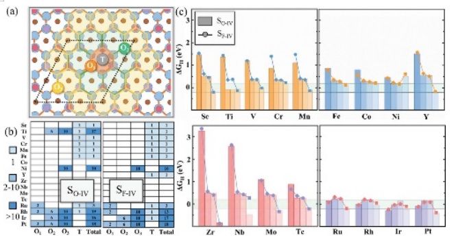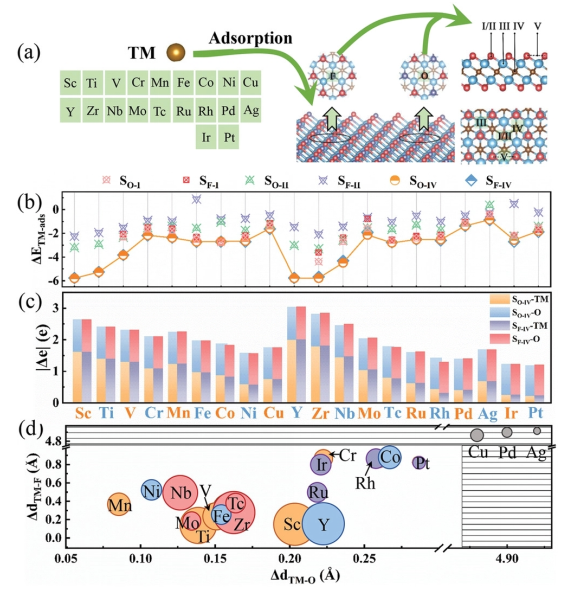 Figure 2.(a)TM吸附位點和吸附單原子類型示意圖,在圖中,不同化學環境中有兩種類型的原子(F,O),各種具有五個TM吸附位點,即-F或-O空位(S