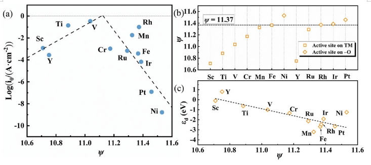 結構進一步對近兩百種過渡金屬組合篩選表明,金屬Rh,Ti,Ir和Pt是最佳的過渡金屬,可增強對應變調節的敏感性,并減少氫氣產生的激活屏障。引入描述符ψ,提供了一種有用的方法尋找最有前途的TMs-Ti