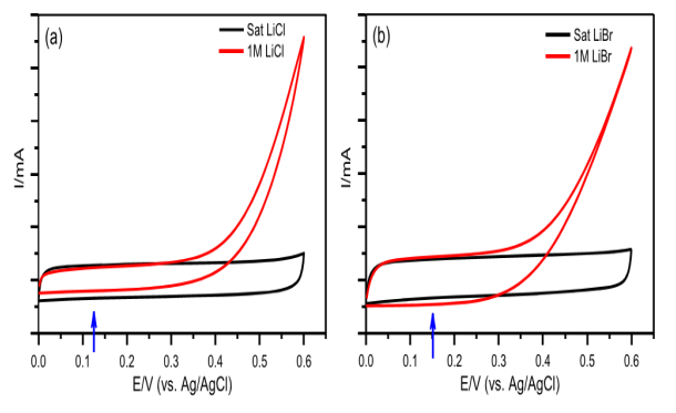 Figure 1.(a)MXene電極在稀釋和濃縮的(a)LiCl和(b)LiBr電解質(zhì)溶液中的循環(huán)伏安圖,以10 mV/s測(cè)試。藍(lán)色箭頭代表集中系統(tǒng)中電極的OCV。