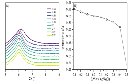 Figure 5.(a)在-0.3至0.5 V電位掃描期間測(cè)量的2q值的變化(相對(duì)于Ag/AgCl)。(b)MXene電極d間距的相應(yīng)變化。