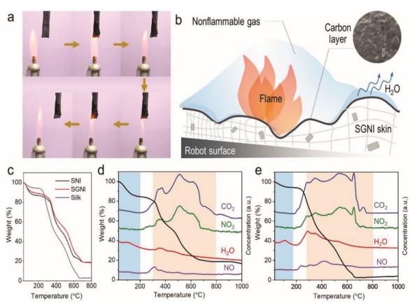 Figure 3. SGNI皮膚的阻燃性。(a)SGNI皮膚的燃燒過程。(b)SGNI皮膚的阻燃機制。(c)SNI皮膚、SGNI皮膚和脫膠真絲纖維的TGA曲線。(d,e)SGNI皮膚和脫膠真絲纖維的熱重分析/質譜圖。