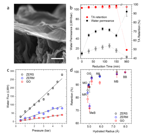 圖 5. GO、ZERS膜和ZERM的滲透和保留行為。 (a)厚度約為 34 nm的PVDF支撐的 ZERS 膜的橫截面SEM顯微照片(比例尺為 400 nm)。 (b)在ZERS還原90分鐘和 ZERM 還原120分鐘時觀察到具有最佳滲透選擇性的 ZERS 膜(填充子彈)和 ZERM(空子彈)的水滲透率(黑色數(shù)據(jù)點)和 TA 保留率(紅色數(shù)據(jù)點)。 (c)最佳 ZERS(黑色)、最佳ZERM(藍色)和 GO(紅色)的水通量與施加的跨膜壓力。 (d) 最佳 ZERS(黑色圓圈)、最佳 ZERM(藍色菱形)和 GO(紅色方塊)的具有不同電荷和尺寸的探針分子的保留性能作為水合半徑的函數(shù)。帶橫劃線的符號代表帶負電的探針,帶內(nèi)十字的符號代表帶正電的探針,空符號代表帶中性電的探針。
