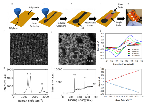 2激光。 (b) CO2激光劃線。 (c) 所得 LIG。 (d)在電極桿和銀漿上應用丙烯酸拋光劑作為鈍化層在電極接觸墊上的應用。 (e) LIG的實際圖像。 激光誘導石墨烯電極的表征: (f)500倍放大倍數下的SEM圖像。 (g)5000倍放大倍數下拍攝的SEM圖像。 (h)拉曼光譜。 (i)XPS 測量。 (j)10、25、50和100mM/s下5 mM亞鐵/亞鐵氰化物的循環伏安圖。 (k) Randles-Sevcik 圖。