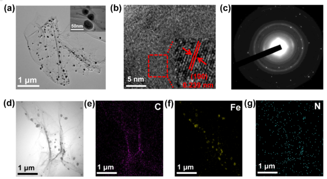 2N/N-rGO的STEM圖像和(e)碳、(f)鐵和(g)氮的元素圖。