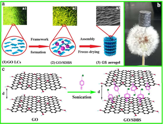 Figure 1. 雙壁蜂窩狀GS復合氣凝膠的合成過程包括(1)使用改進的Hummers方法制備GO LCs凝膠,(2) 通過經濟高效的SDBS表面活性劑形成骨架并誘導自組裝,(3) 通過冷凍干燥制備GS氣凝膠。(a1)GO LCs懸浮液的偏振光學顯微(POM)圖像;(a2) GS分散體中的均勻微泡和 (a3) GS氣凝膠的SEM圖。(b) 具有超低密度 (ρ=12.5 mg cm