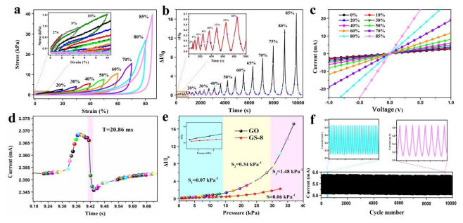 Figure 5. GS-8氣凝膠作為壓阻傳感器的特性:(a) GS-8 氣凝膠在設定應變為2-85% 時的應力-應變(σ-ε)曲線;(b) GS-8氣凝膠傳感器在2-85%的相應設定應變下的I-T;(c) GS-8氣凝膠傳感器在設定應變為2-85% 時的I-V曲線;(d) GS-8氣凝膠傳感器的即時響應,其響應時間為20.86 ms;(e) ΔI/I